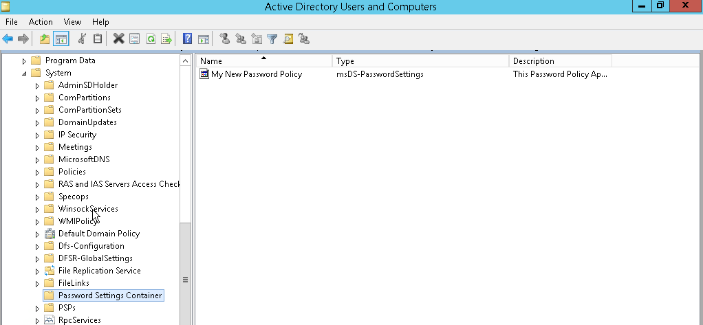 If you have domain admin level privileges, you will see “system\Password Settings Container” underneath your domain name on the left.